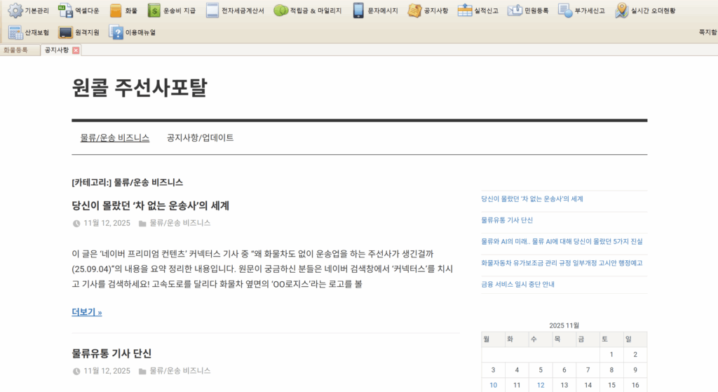 포탈에는 일반 정보 공유 목적 물류/운송 비즈니스 게시판과 업무 정보 공유 목적 공지사항/업데이트 게시판